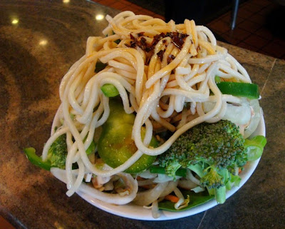 I started with a pile of spinach (no meat for me) on the bottom and built up layers of carrots, sprouts, peppers, onions, water chestnuts, zucchini, broccoli, mushrooms, baby corn, a few noodles and topped it off with soy, garlic, teriyaki and dragon (flaming HOT) sauce.