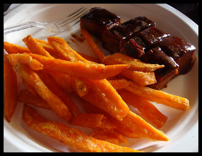 As you can see, they do not put a lot of thought into fine china. But I do enjoy where they place top priority. THE MEAT ~ So tender a knife is not required, it truly falls apart. Oh, and lots of BBQ sauce on the side for dipping. The sweet-potato fries with sour cream, SO GOOD!