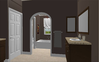 We have been spending countless hours in the design stages of our new home. I’ve been working very hard in the master bathroom and this is the layout I’ve come up with. As you walk into the bathroom the closet is immediately on the right. Then the Mr’s “high” sink is on the right and the Mrs. lower Vanity and counter area is on the left. The linen closet is next to the Mrs. Vanity. Walking through the arch the shower is on the right, (hubby’s giving us a large shower with duel shower heads), tub in the center and the toilet on the left.