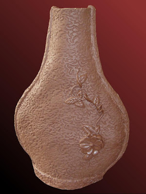 Just finished adding the final touches to this piece this morning by adding the strips to the sides, the vine, leaves and flower. My dearest is ready to crank up that kiln for a bisque firing but the pieces have to dry first. He’s getting another table for me this weekend so that I can get all set up in the garage for glazing. We’ll probably do a load of bisque the first of the week and then I’ll be in business to start using those commercial glazes we picked up last week. Fingers crossed!